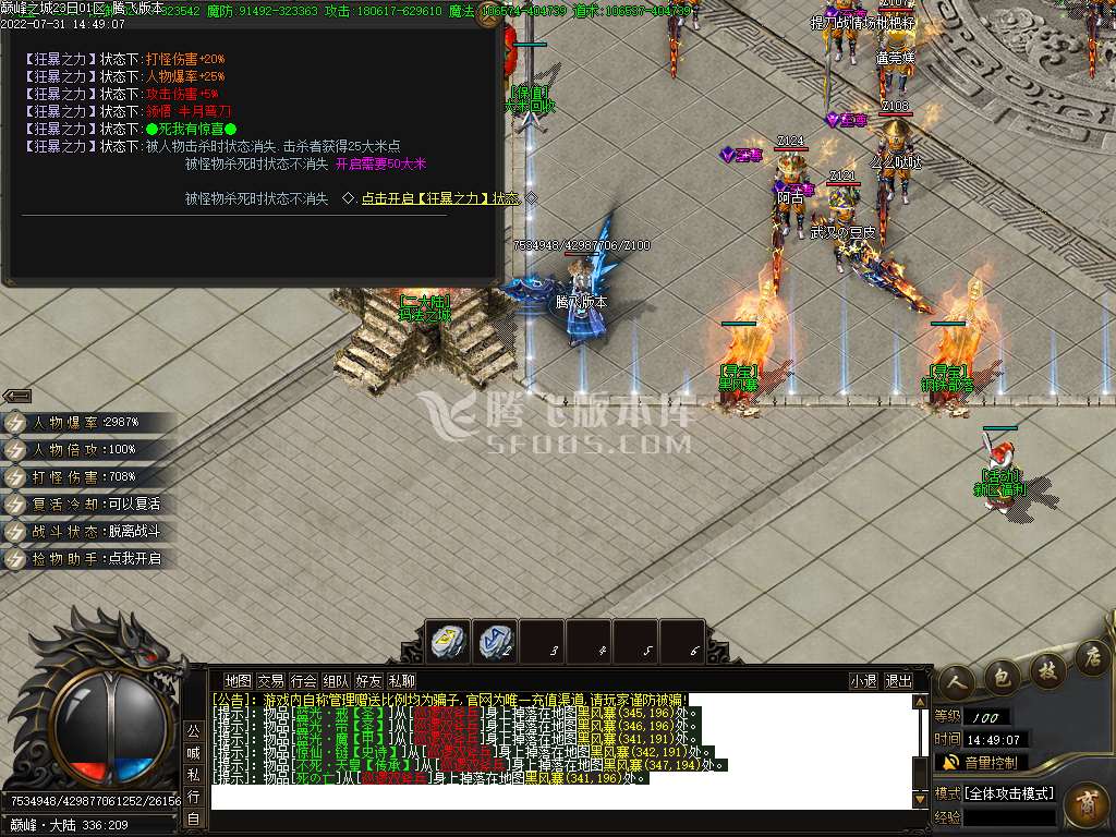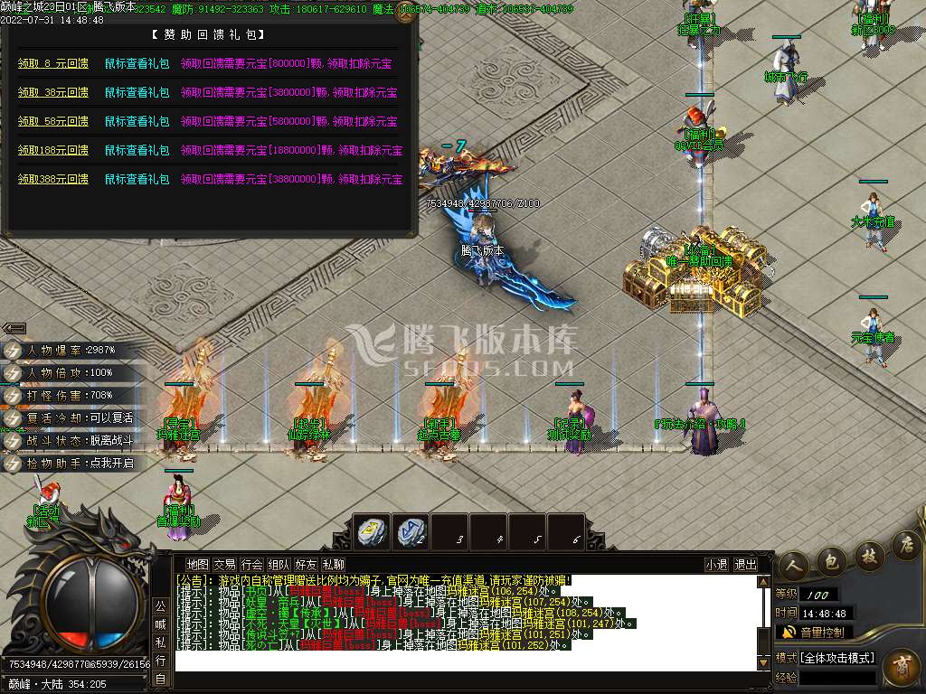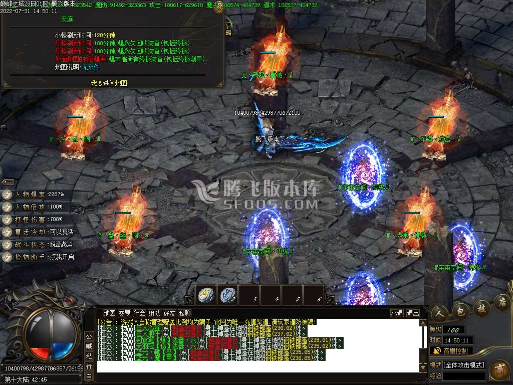 1.天隆财宝:开启时,土城药店附近会掉落满屏宝物玩家随意拾取有缘得之。