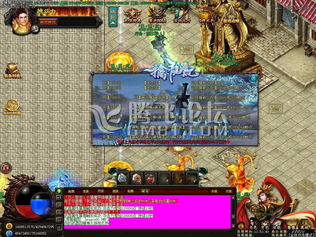 【游戏介绍】擒龙记单职业,独家打造,市面绝无仅有,游戏耐玩,玩法独特,特色活动,人气火爆!【独家制作】1080P 级完全真彩画质体验3D颗粒级视觉大赏,前所未有视觉体验,实力团队运营!【充值介绍】元宝1:10000 龍鳞币1:100 多充多送,所有充值请走平台.要求转账都是骗子!【装备爆率】一切装备靠打全爆,爆率完全看脸,只要你有时间,元宝.装备.等级一切不是梦!【开区模式】每天开放六个新区,10点30、13点30、16点30、19点30、22点30、00点30、测试区提前2小时开放!【攻沙奖励】新区开放第二天晚上拿沙奖388元充值、第三天合区拿沙奖388元充值+388点RMB!【温馨提示】担保买卖装备,请加右边群走担保,如今社会什么类型骗子都有,勿贪小失大,得不偿失