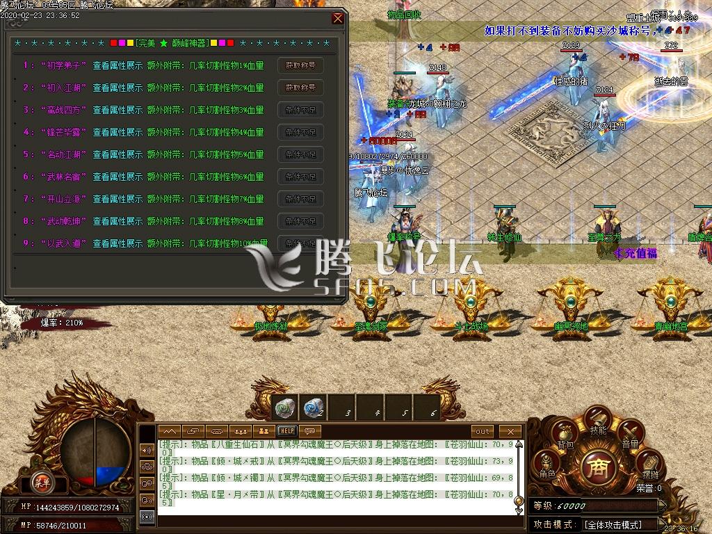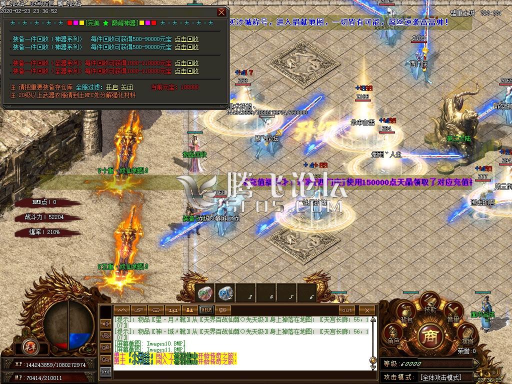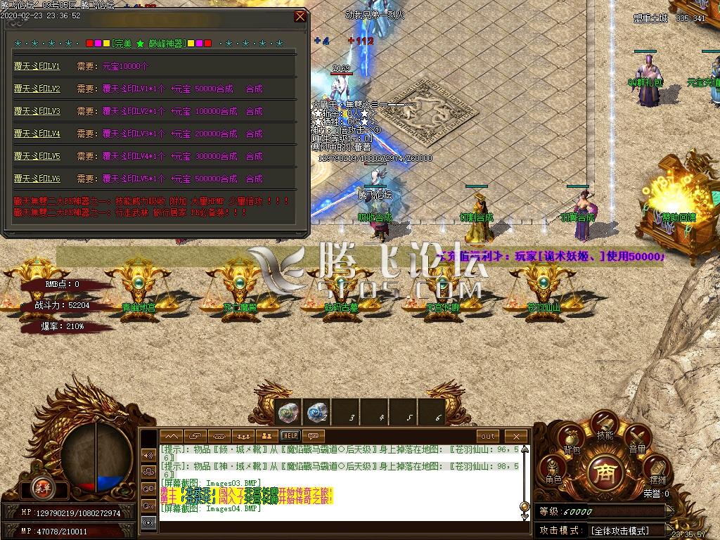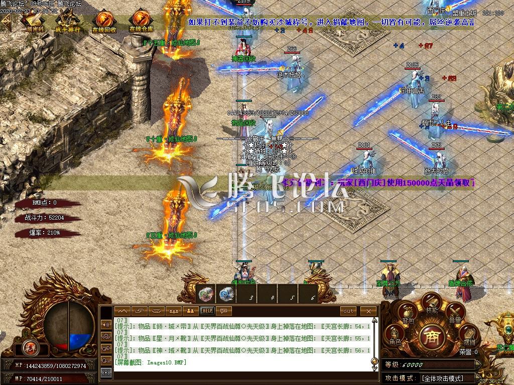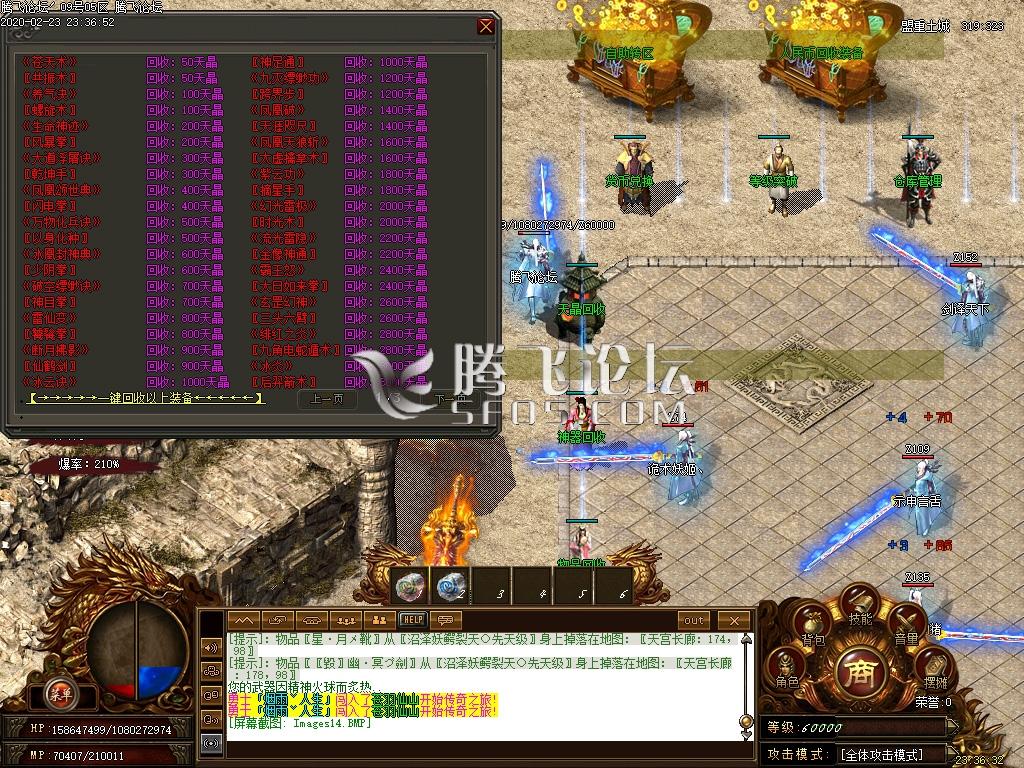 天晶篇:玩家可以把打到的神器,60以上首饰,40以上武器衣服到土城,爆率高,6大陆起怪物满地爆。