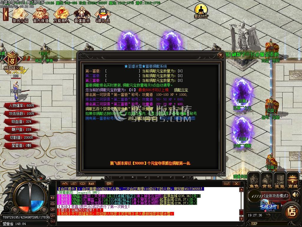 圣墟冰雪单职业-带假人-带光柱-起号奖励-金币捐献-实物-通天之路