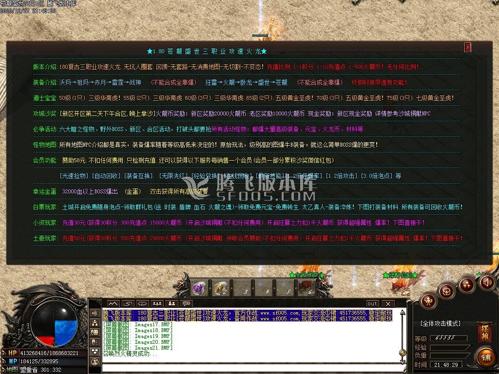 版本介绍:180复古三职业攻速火龙.无坑人圈套.回馈-无套路-无消费地图-无切割-不变态!充值比例:1-1积分.1-10充值点.1-500火龍币!无任何比例!