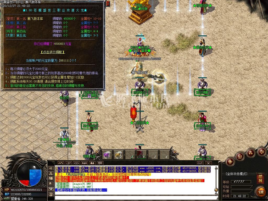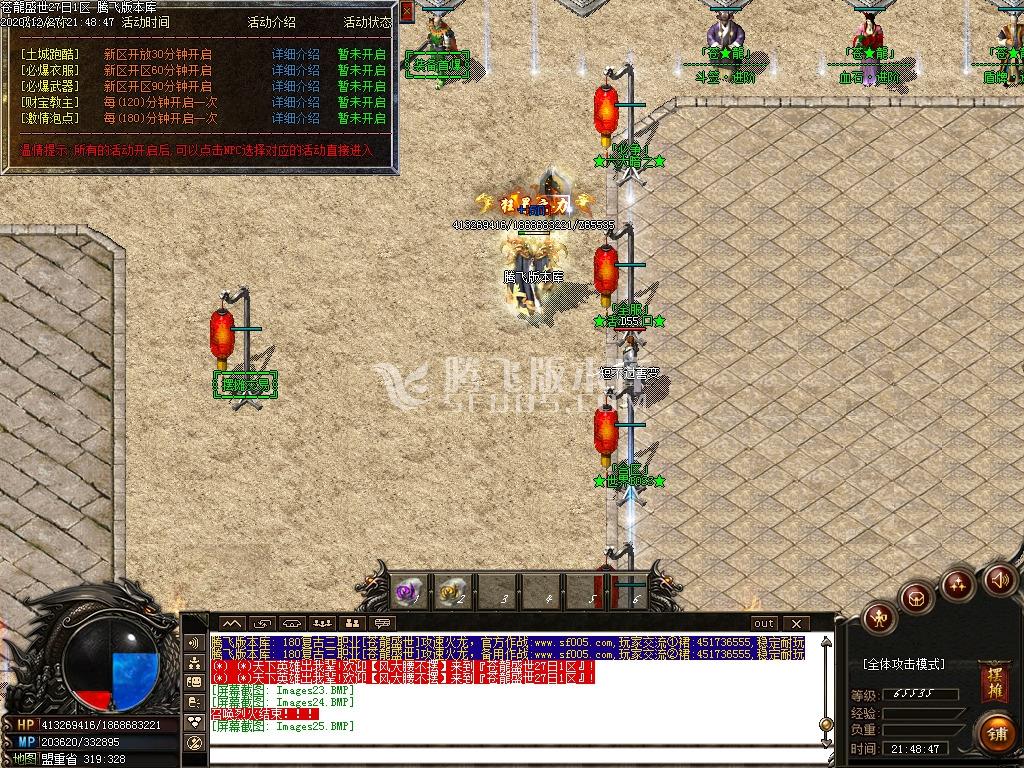 10:00 14:30 19:00 22:30)新区开区第二天下午合区,晚上拿沙].火龍币奖励:新区奖励20000火龍币.老区奖励10000火龍币.现金奖励:新区现金奖励.详情参考沙城捐献NPC