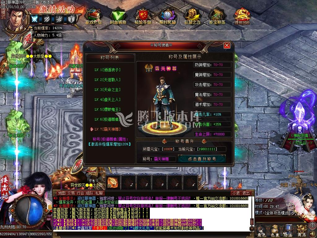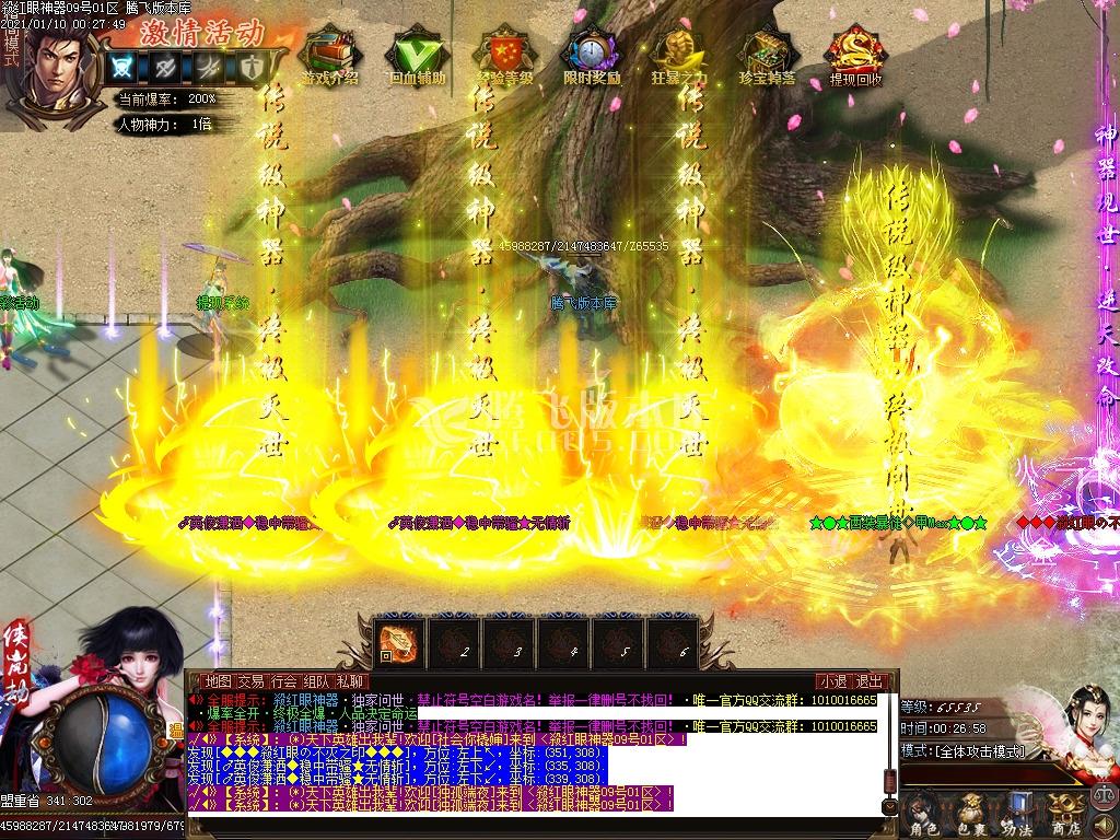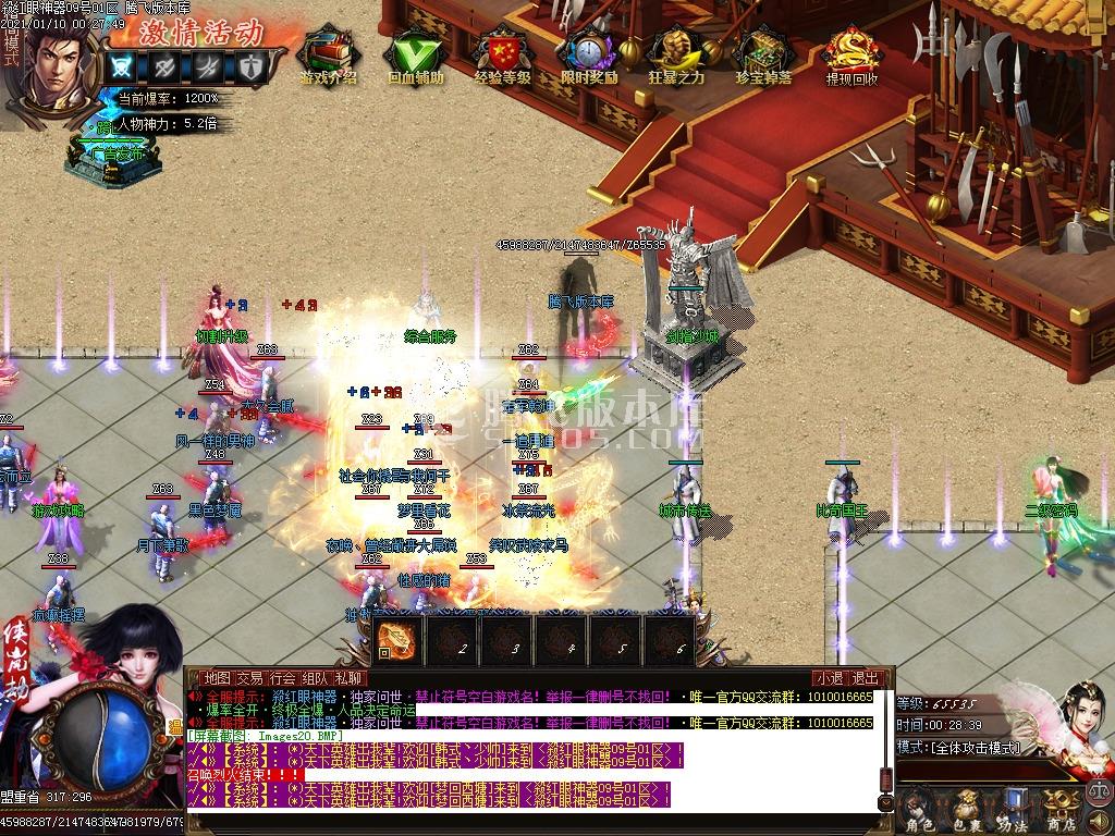 2.新区疯狂等级,新区一个小时内等级达到500级,独享专属BOSS ,必爆29-30阶剑甲!!