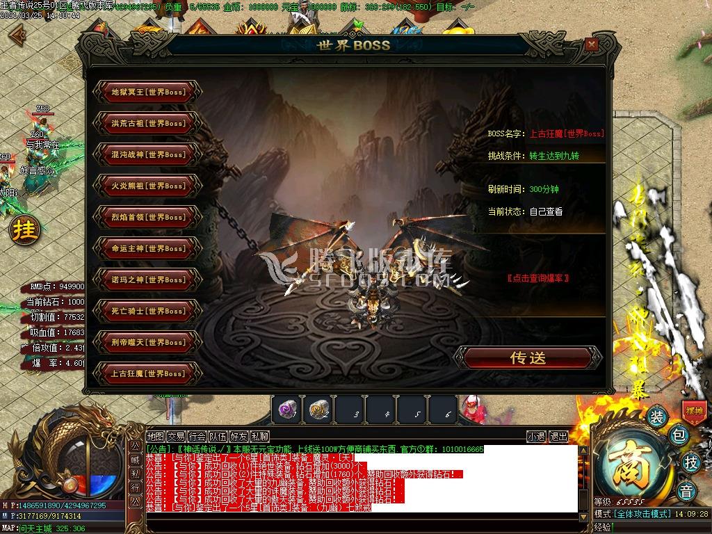 (问天)全服公敌·超级Boss 刷新地图:神魔之路.炉火纯青2层.等 刷新时间240分钟 爆本服所有终极!