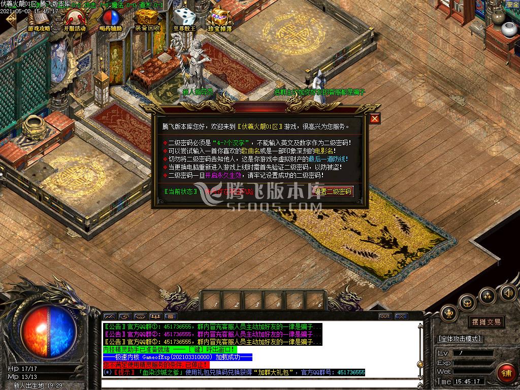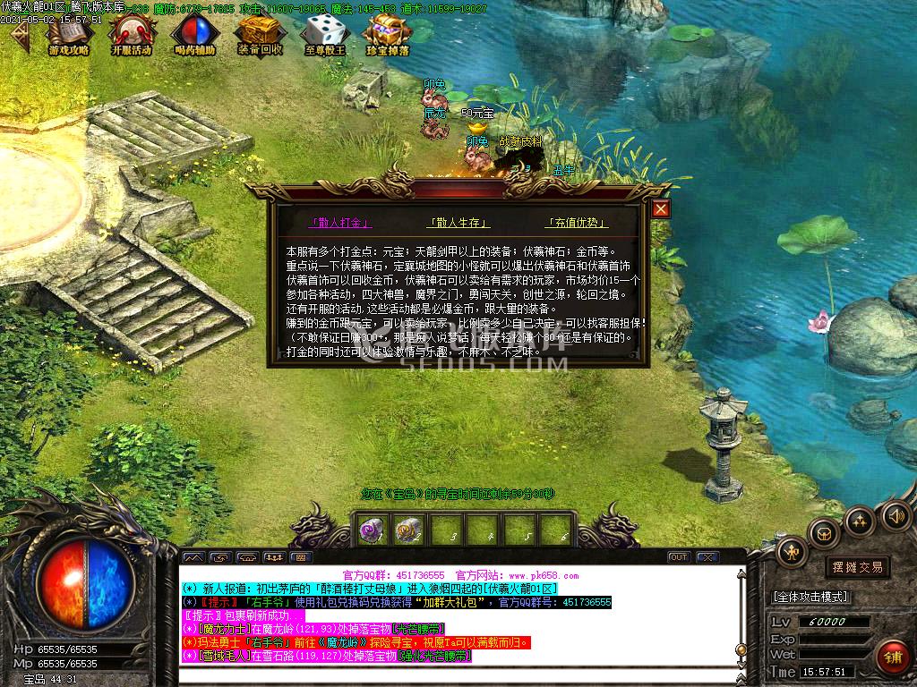 游戏介绍:无任何隐藏·装备靠打·长久稳定·激情耐玩·爆率全开·每天开放2-3个新区·风里雨里·伏羲等你2021-5月