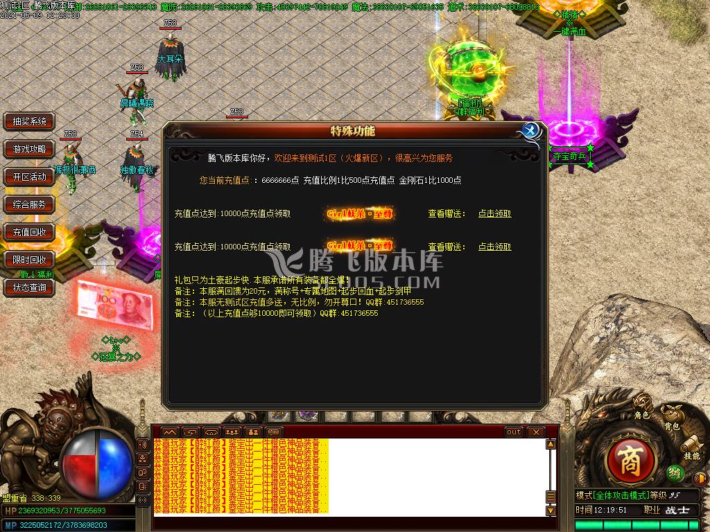 介绍:本服元宝充值点超级好打,充值点一小时打1000以上,人人可以满回馈。