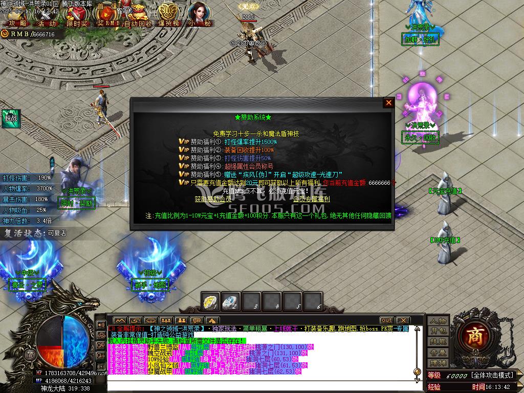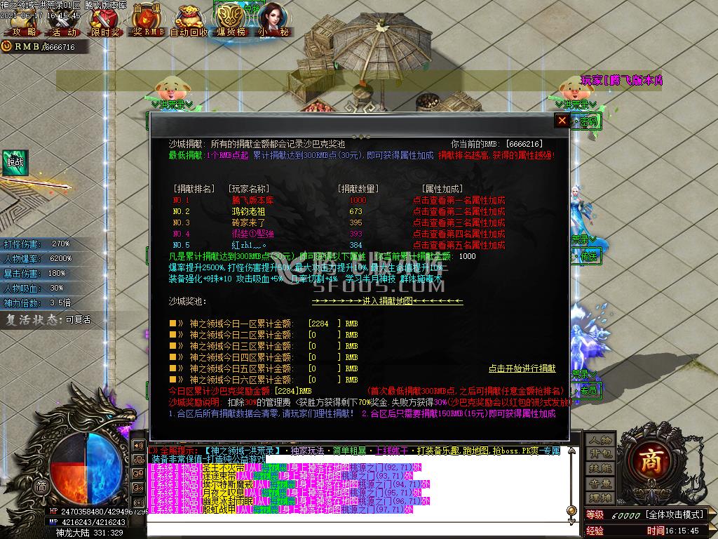 ★★充值玩家攻略★★: ★30元沙捐献★ (爆率提升3000%,打怪伤害50%,攻击提升10%,生命值+10%,半月技能,群毒。 送+9套)