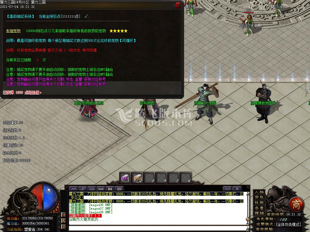 高级抽奖: 土城最左下角 [累计抽奖300次,必出一个终极宠物,累计2.3倍攻击,全屏麻痹怪物,也可合成]