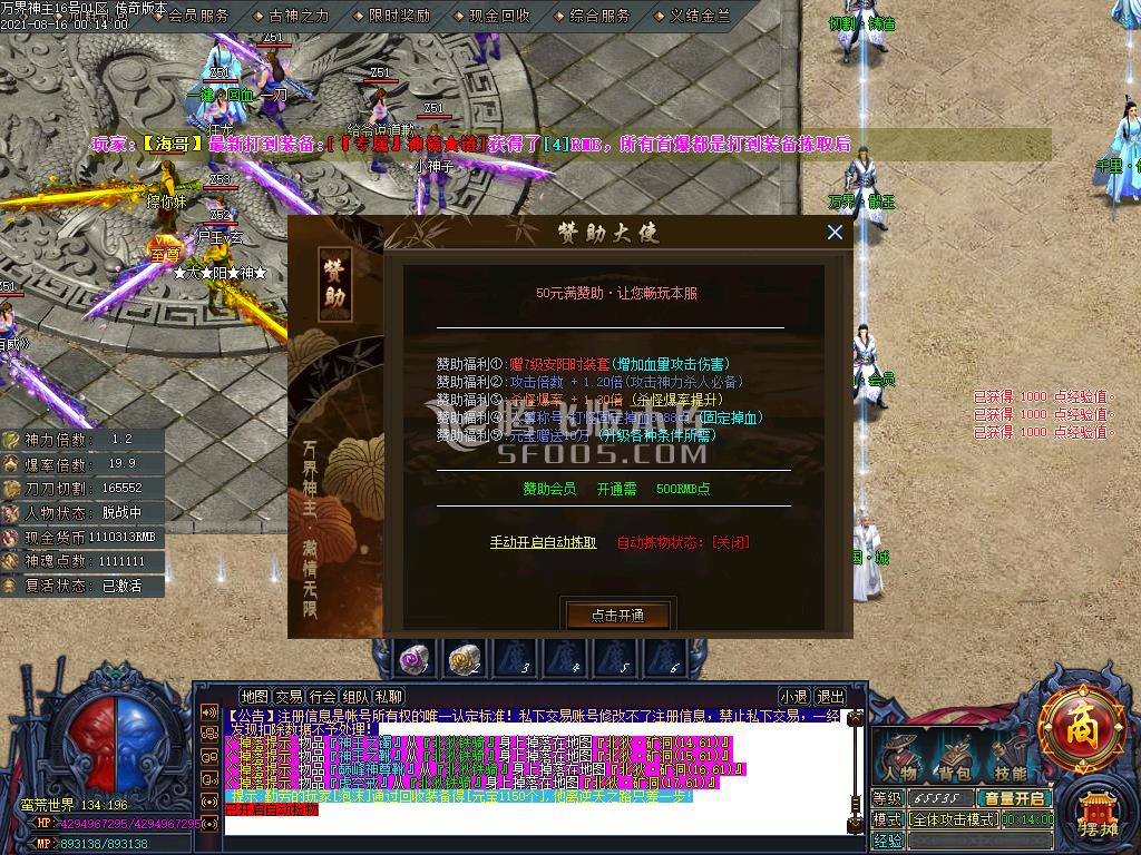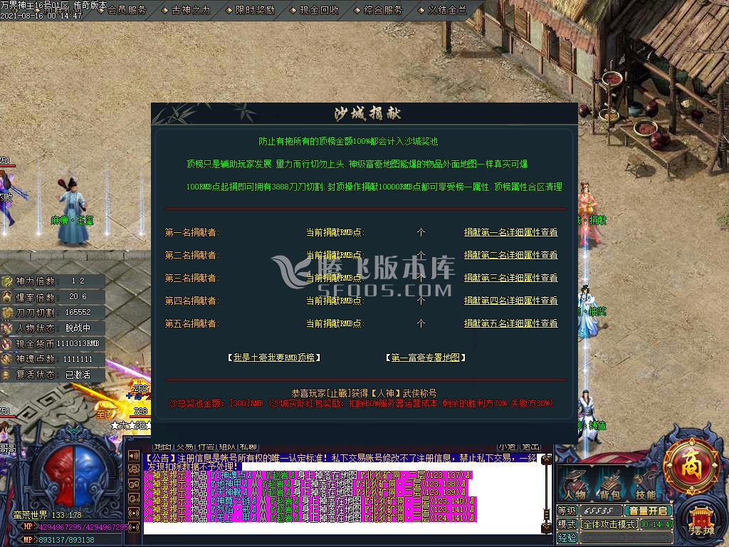 充90RMB 30R开沙城捐献赠送自动秒回收 50R开启顶级赞助会员自动拣取.10R开狂爆加100%爆率90元畅玩本