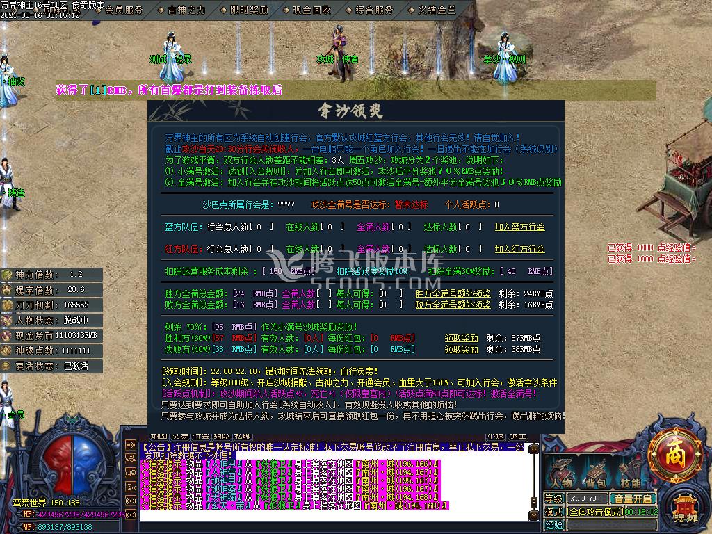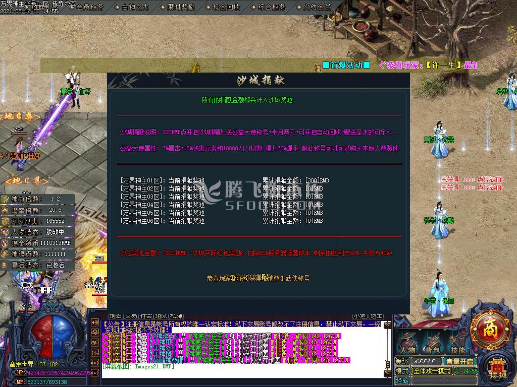 特别强调:本服白嫖很辛苦.因为限时奖励和永久回收都是RMB,最少要30元开沙城捐献+10元会员才可发展.