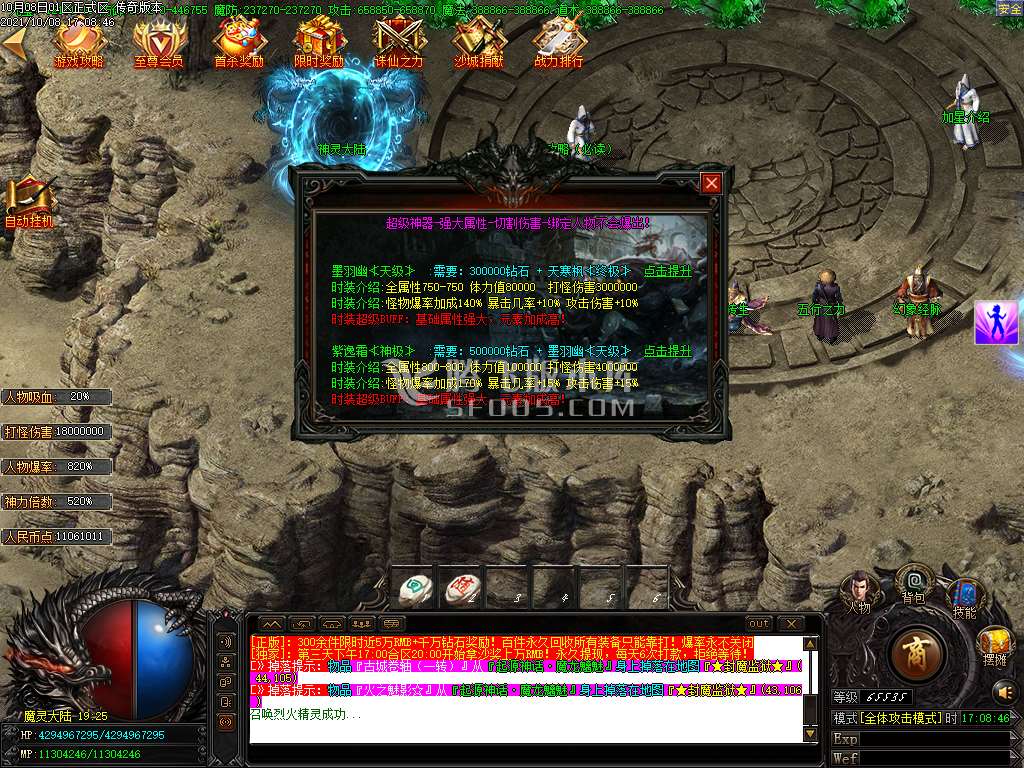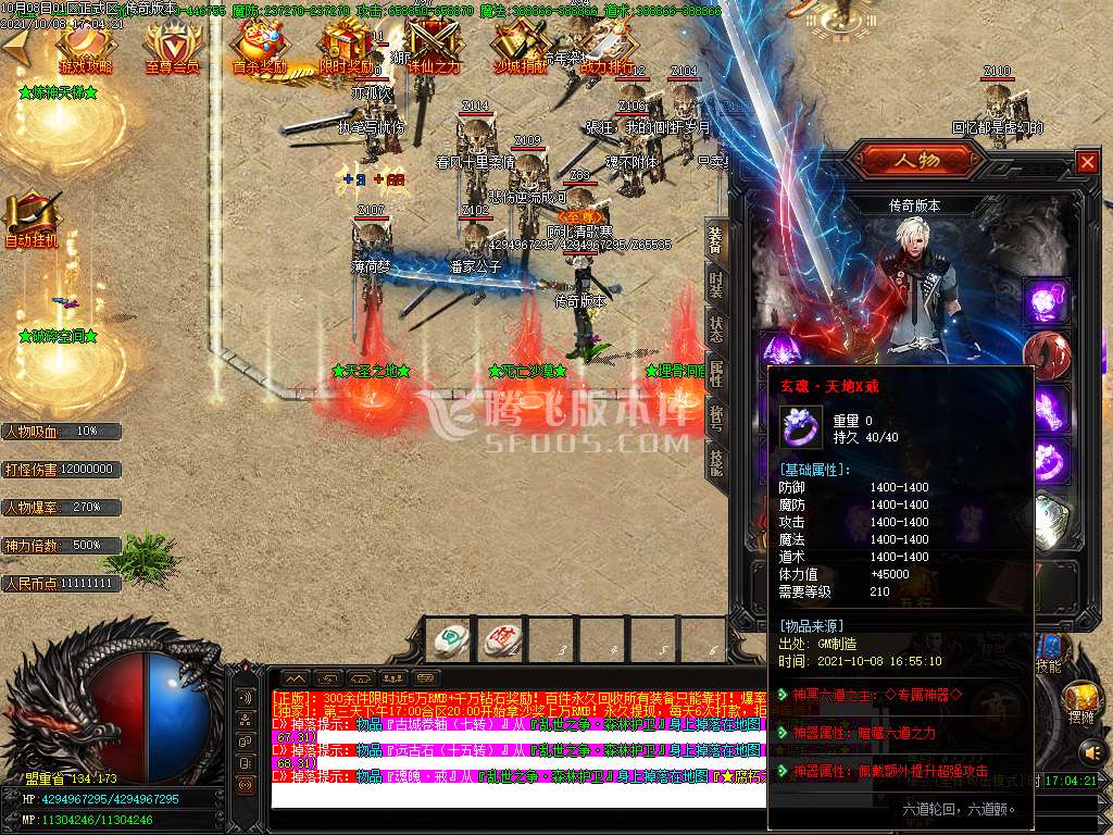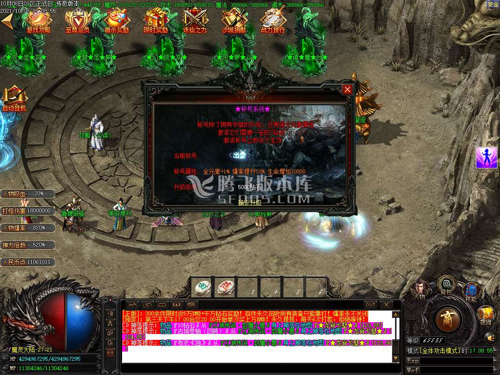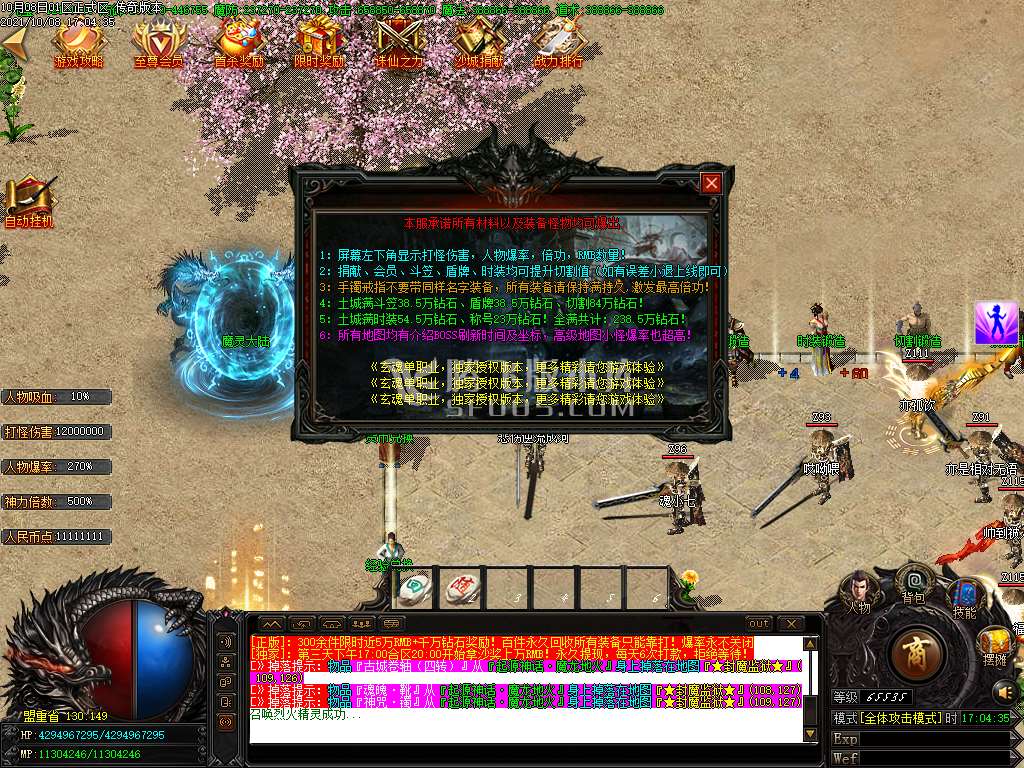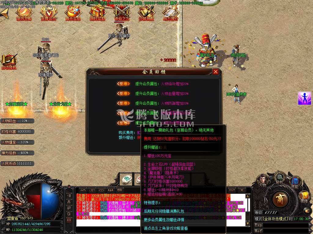 办理会员需要10万钻石 (50元)(获得爆率,倍功,打怪伤害 全屏吸怪 半月弯刀 魔法盾 隐身术 送10转+100万元宝)