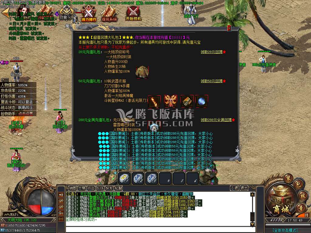 顶级消费:288礼包+19元RMB(聚宝盆)+50元RMB(沙捐+狂暴)+88元RMB(二大陆称号,刀刀切2%)+1200元RMB(顶级时装)=1645元