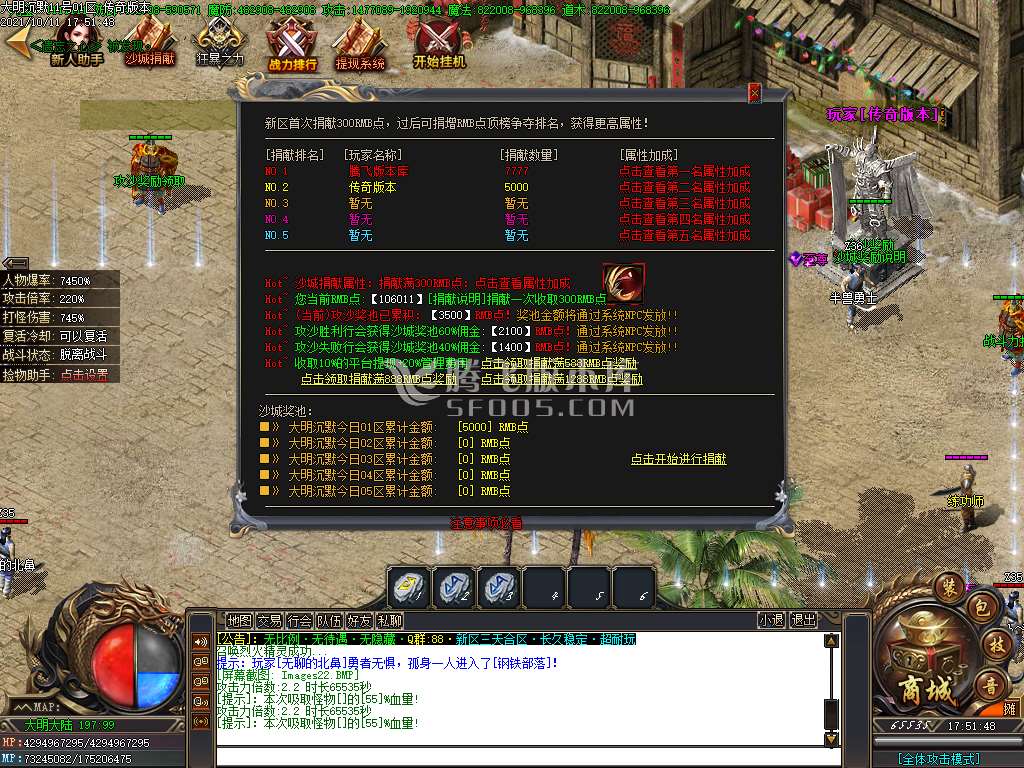 土豪消费:288礼包+19元RMB(聚宝盆)+50元RMB(沙捐+狂暴)+88元RMB(二大陆称号,刀刀切2%)=445元