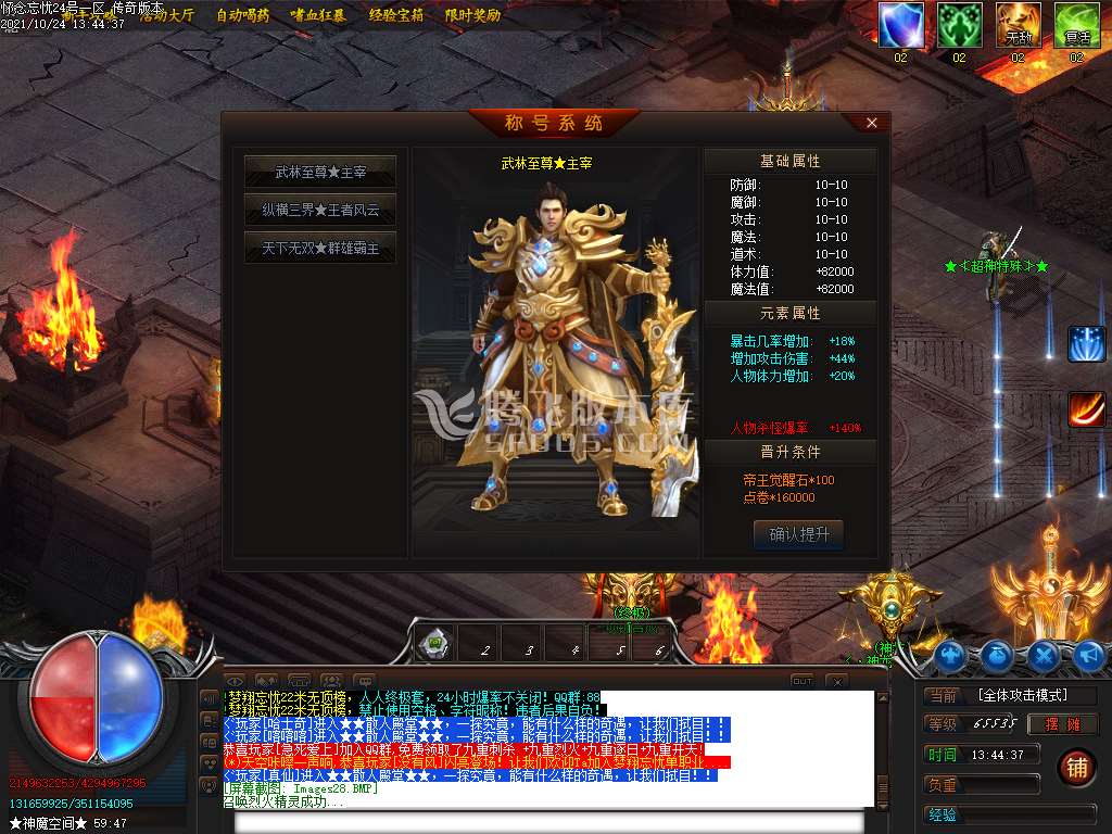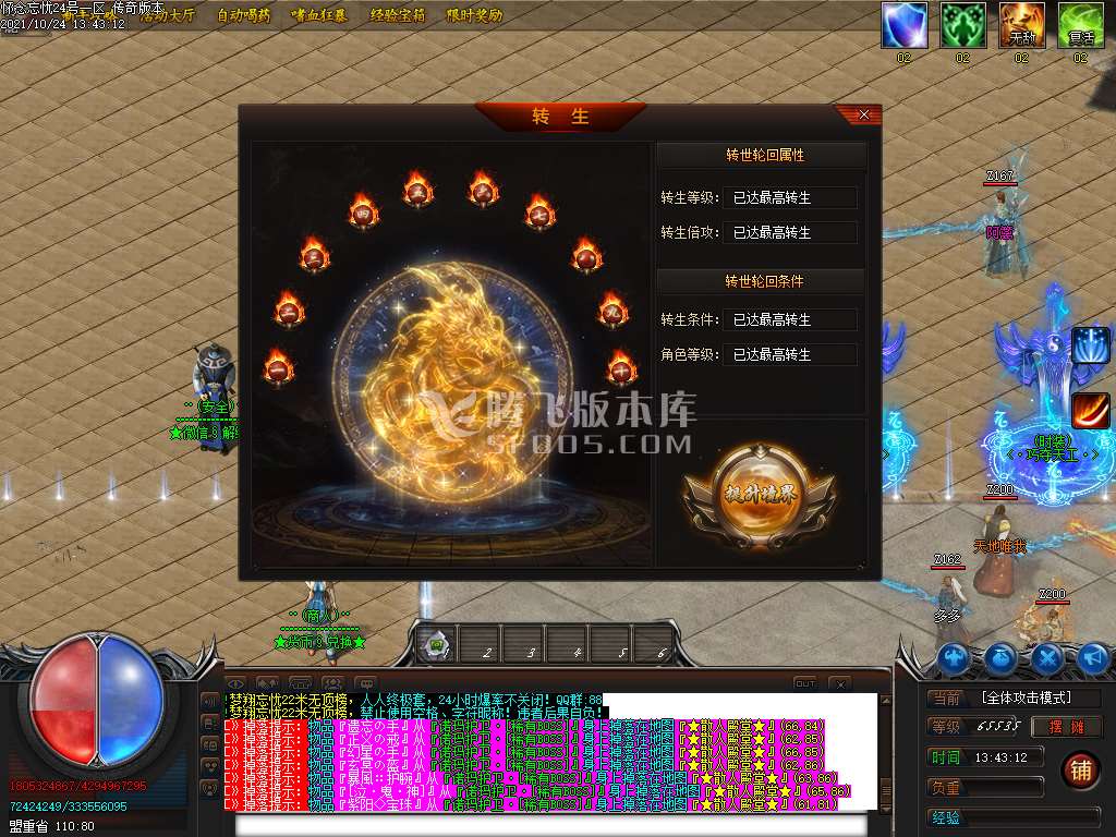 新手上线免费满转,无需转生,三大陆用帝王觉醒石升级,可升到500级,多余的石头可换点券合盾牌
