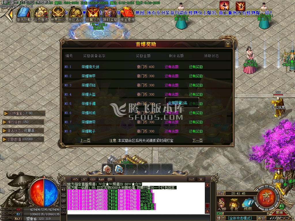 测试区:打无限打粉色怪物回收元宝正式开区可以领取起步阶段快。