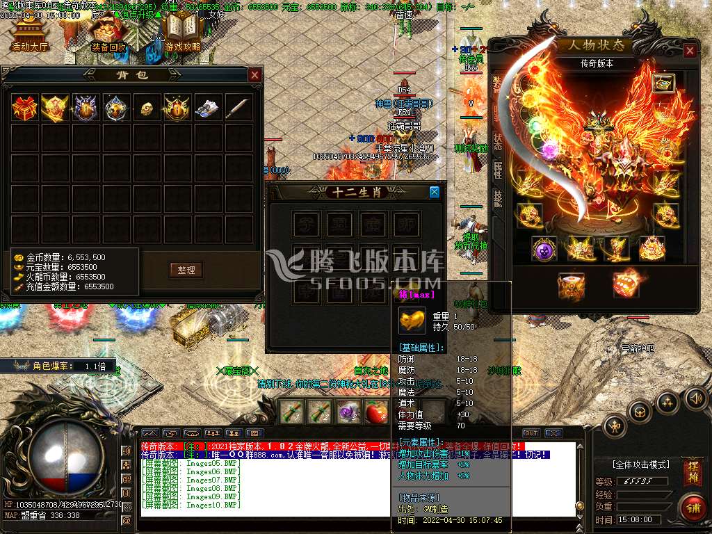 【当充值满100,有100%爆率加成+1.1倍属性+头顶杀图标,或打100只生肖BOSS,也触发1.1倍】领QQ群礼包有守护宝宝,活动地图,藏宝阁,刷终极B00S,爆率非常高基本一晚上终极都能打好多件免费随身每秒50w经验,白金100w经验,钻石150w,至尊200W,大师250W,金牌300W,经验土豪可元宝泡点
