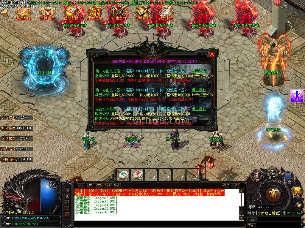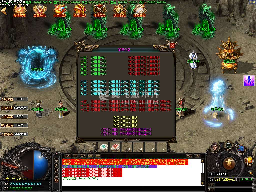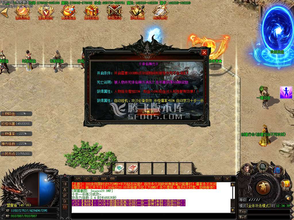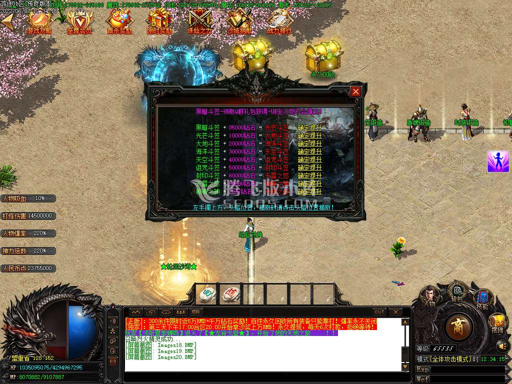 办理会员需要10万钻石 (50元)(获得爆率,倍功,打怪伤害 全屏吸怪 半月弯刀 魔法盾 隐身术 送10转+100万元宝)