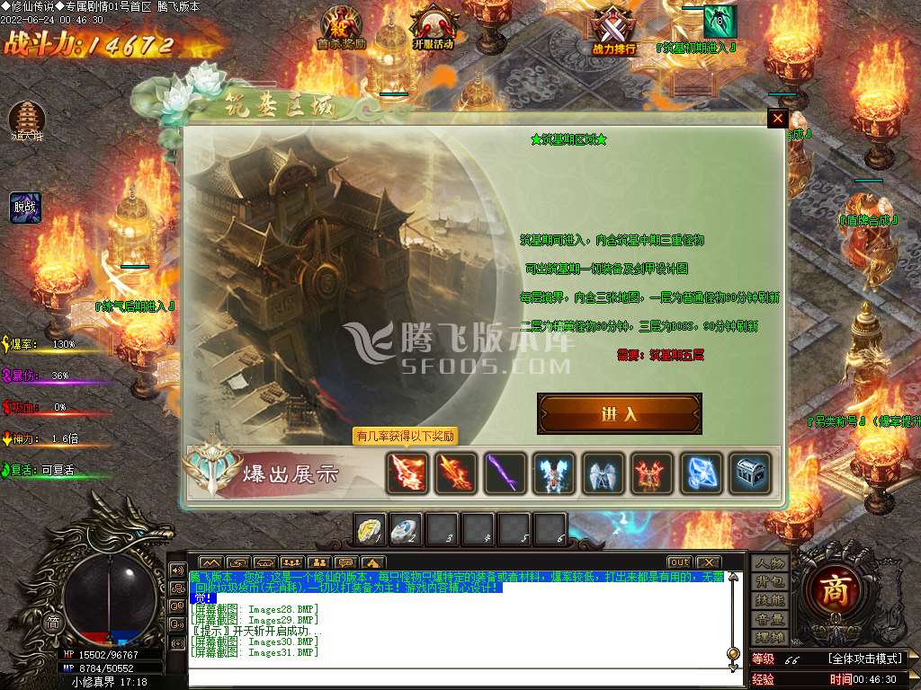 每日-(通天塔)也是必刷-每天都有排名奖励-传承塔奖励可以开出本服所有装备跟材料-极品灵石!里面怪物也是爆所有装备跟材料-灵石--爆率是普通地图的几十倍!!!