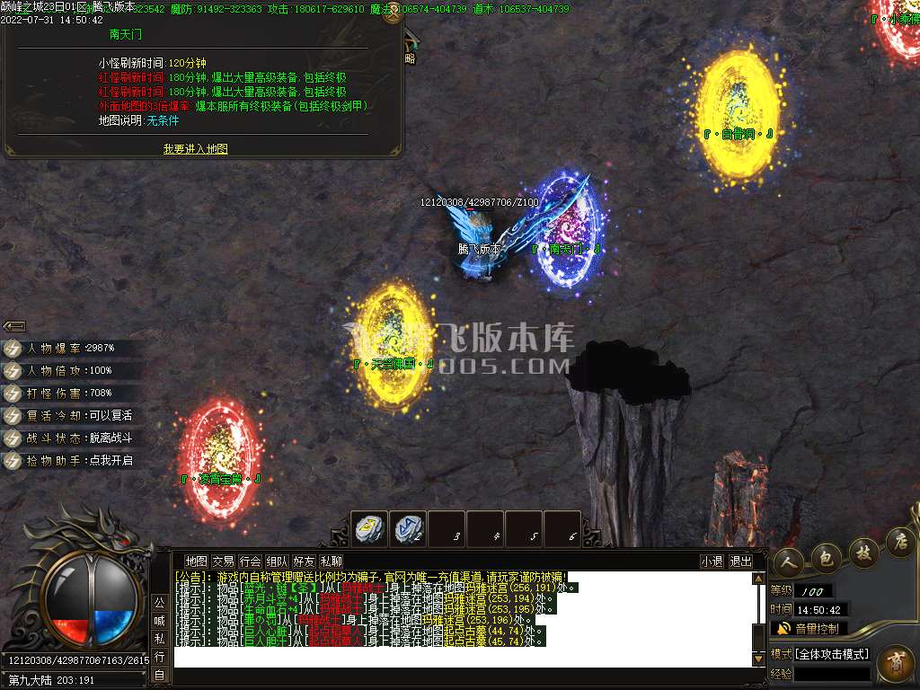 1.天隆财宝:开启时,土城药店附近会掉落满屏宝物玩家随意拾取有缘得之。