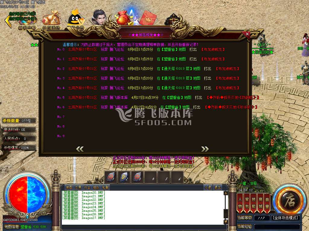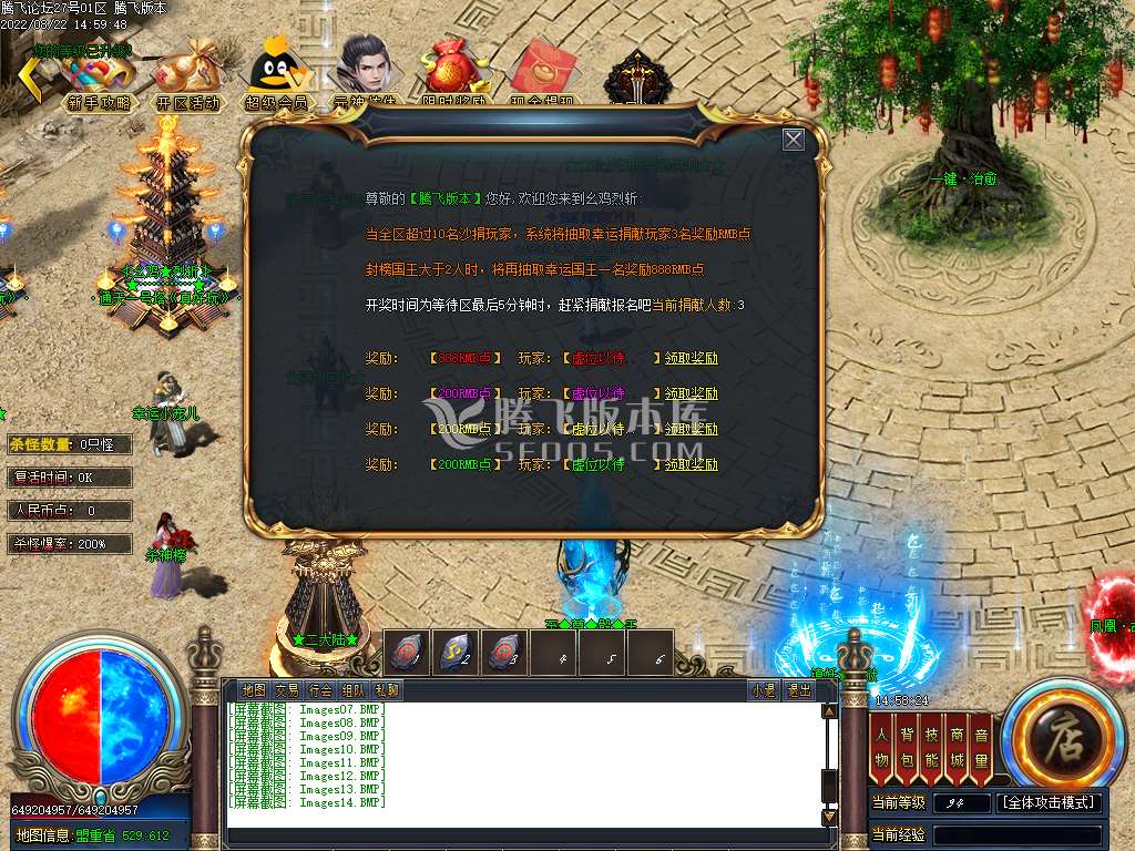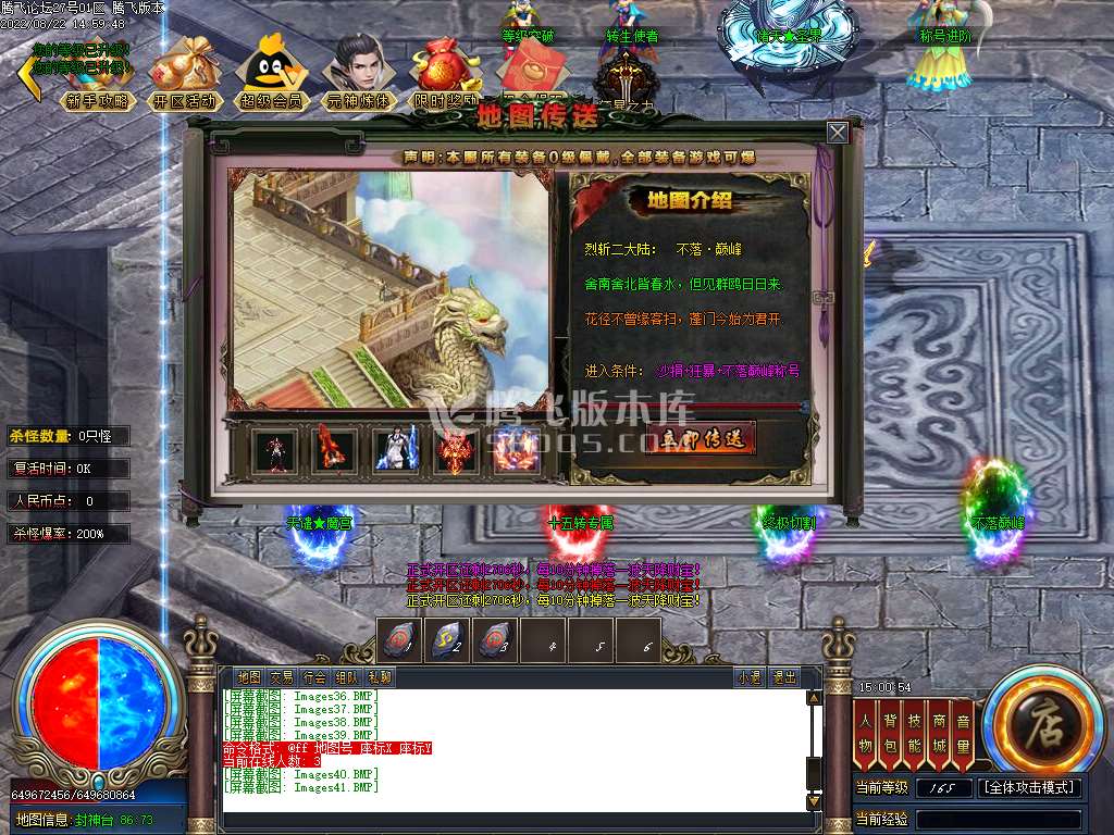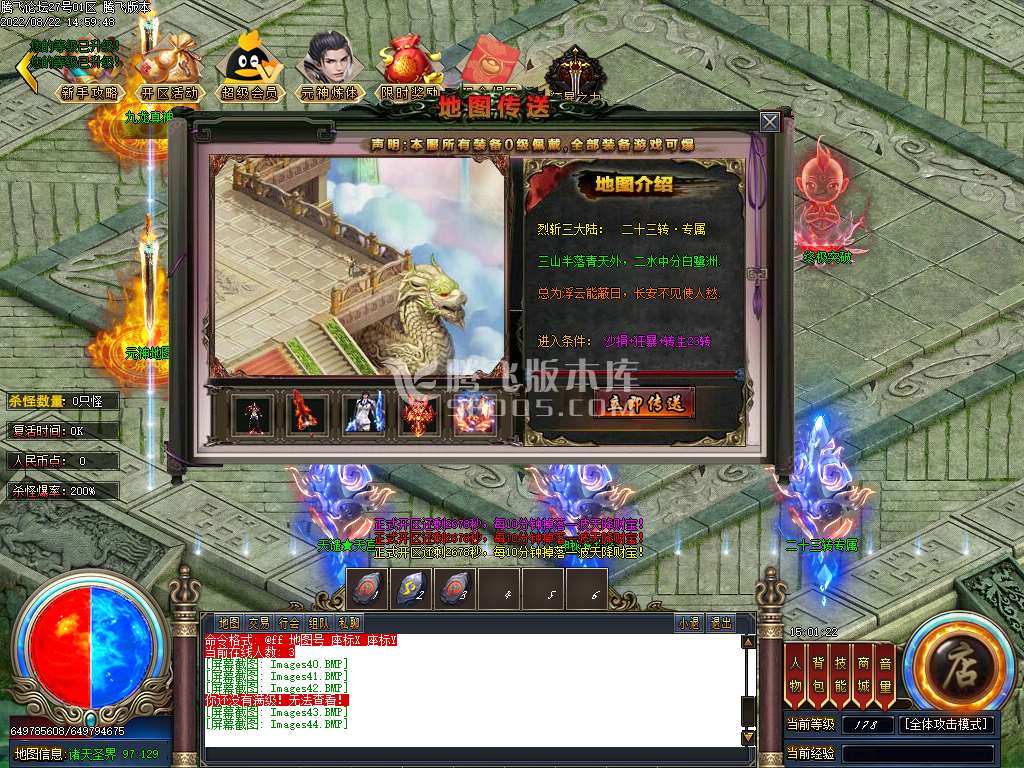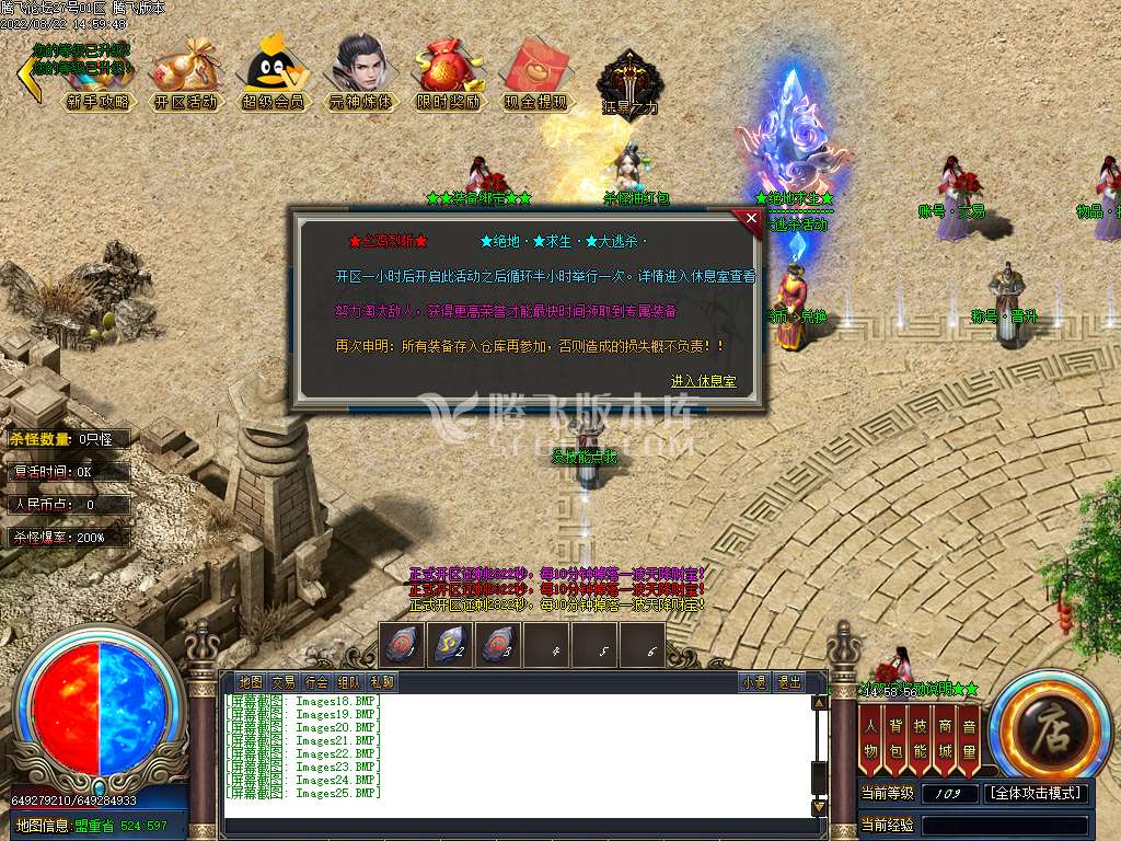 2.等待区泡点升级到300级,开启捐献,荣耀使者,狂暴,观音之怒(带上所有赠送物品,其中面巾有隐身属性,方便开区打怪)。