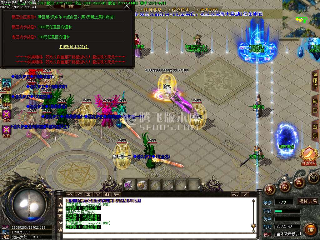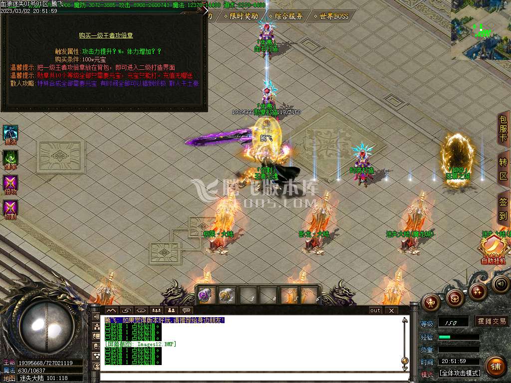 小资:充38元 获得回馈 至尊5件套 开启自动回收自动捡物 开启1挡狂暴(2RMB) 开启沙城捐献(30RMB) 有刀刀168W 伤害 爆率200%