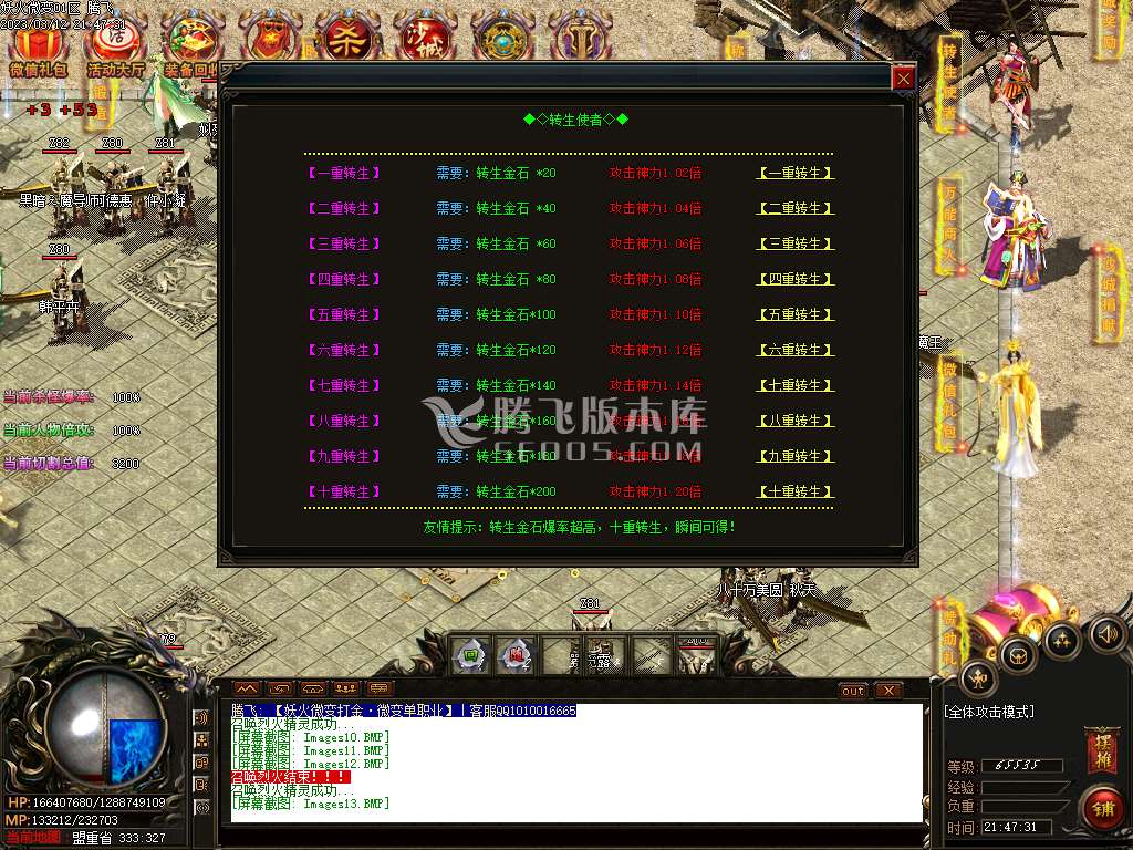 <9、前期可以购买一些转生金石,下地图都需要转生,最多十转。>