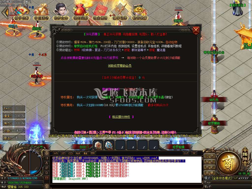 充值30元修罗币 领取赞助会员(送3级麻痹,复活,魂珠,群毒,魔法盾)