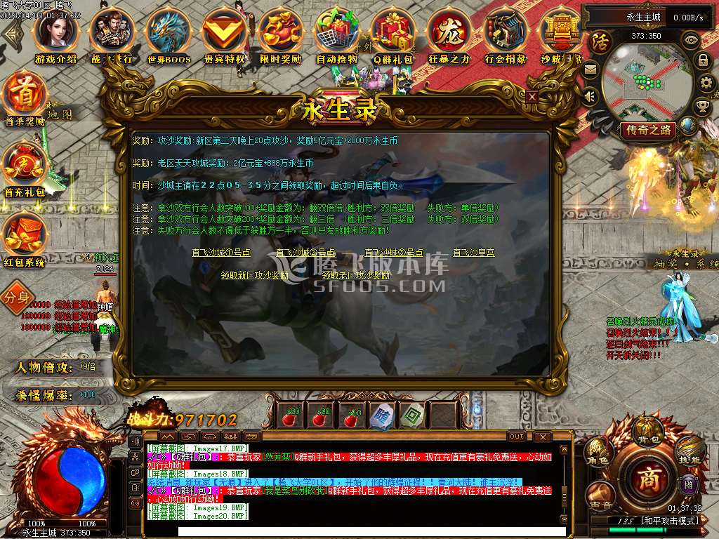 【攻沙奖励】: 新区合区拿沙奖励5亿元宝+2000万永生币,老区攻城奖励:2亿元宝+888万永生币