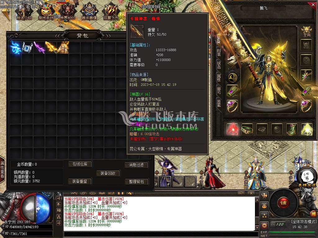 07月昆仑大陆专属神器单职业商业版本库-魔法结界-仙宠升级-技能强化-切割锻造