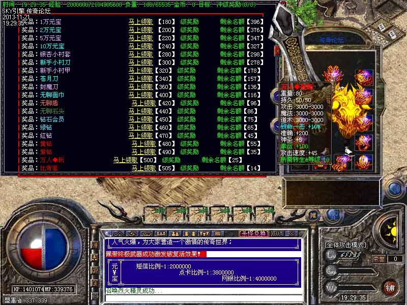 【冲级奖励】:从80级开始升级都有相应物品赠送,升级奖励非常丰富!终极神器也有赠送!