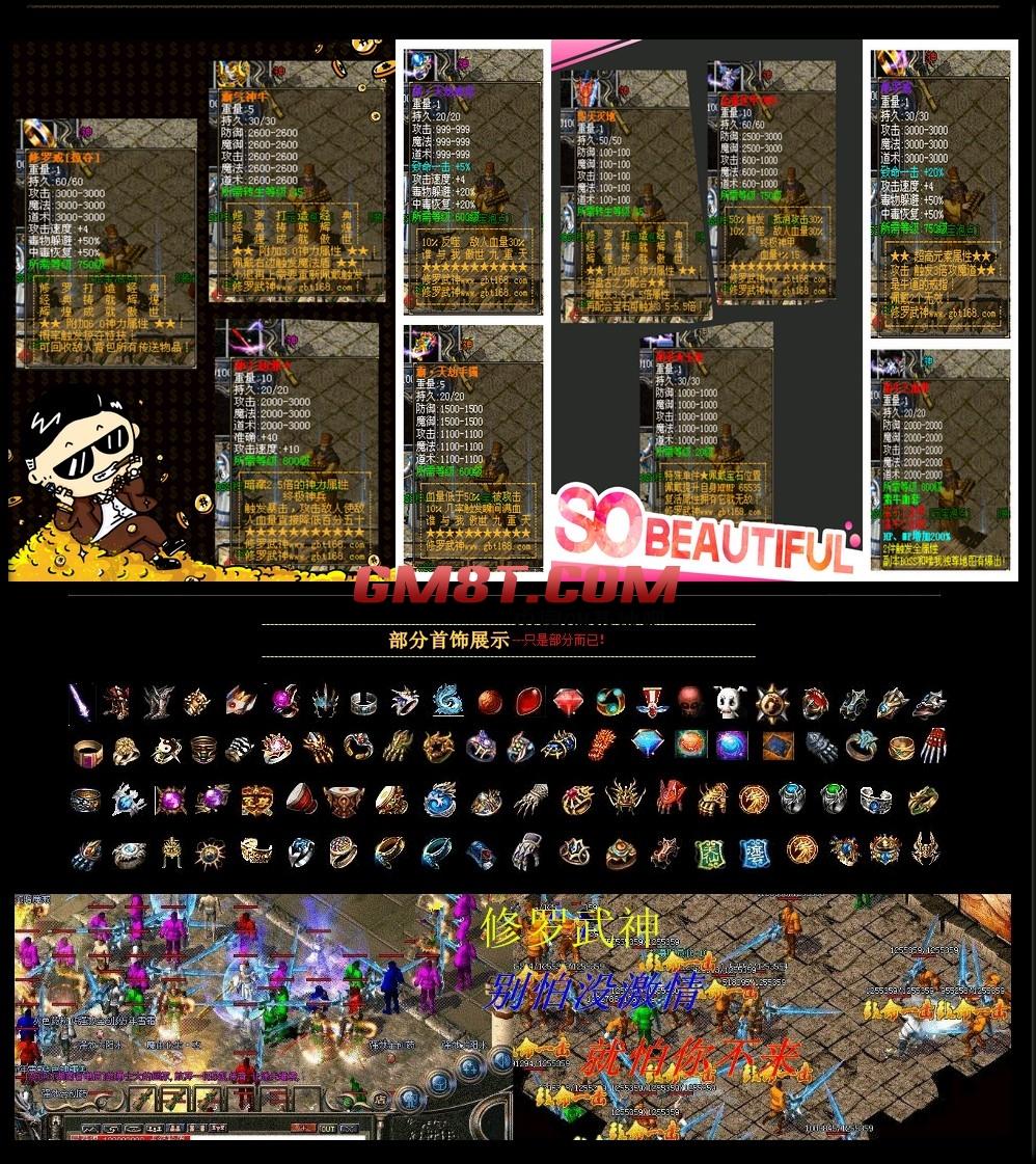 独创百套新地图,绝对新颖,无需补丁,地图设置合理,适合长期游戏,装备绚而不花,后期装备独特的发光效果你绝对没见过独创道士宝宝绝对凶猛,外面靓丽,后期道士更增加神秘宝宝的召唤,让道士后期也能PK战士后期PK绝对超强,建议玩家后期选择战士独创的境界转生系统,保证你没见过,转生超酷封号、境界地图,境界神装,让你越到后期越不能自拔!!独创武器魔化,附灵!独特的打孔镶嵌,本服保证此为新开发,不同于一般版本,绝对有乐趣!具体游戏体验独创装备拆解系统,拆解的材料可以升包括准确,速度,幸运,躲避在内的所有特殊属性独创很多新颖的活动,请玩家积极参加,本服不同于其他服,活动奖励绝对丰富!升级奖励绝对够劲,奖励异常丰富,还等什么,快去练级吧!)