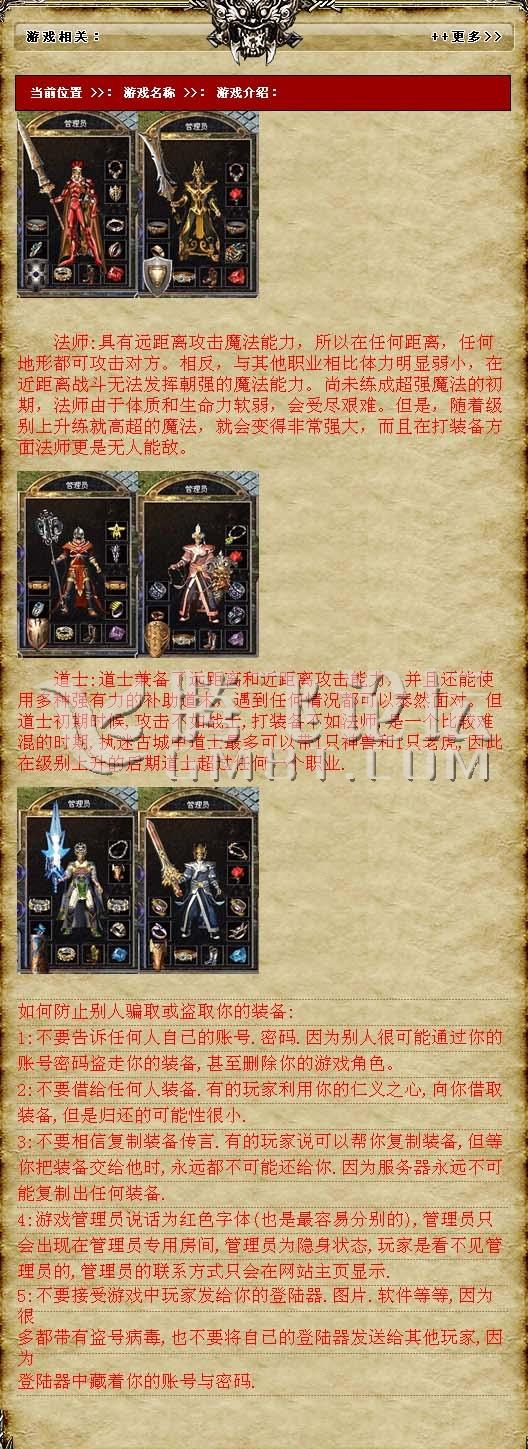 道士:道士兼备了远距离和近距离攻击能力,并且还能使用多种强有力的补助道术,遇到任何情况都可以泰然面对。但道士初期时候,攻击不如战士,打装备不如法师,是一个比较难混的时期,执迷古城中道士最多可以带1只神兽和1只老虎,因此在级别上升的后期道士超过任何一个职业.