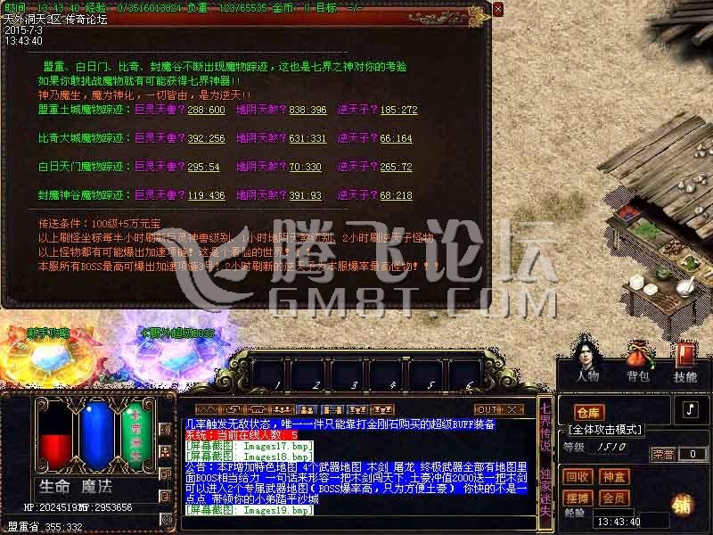 游戏介绍③ >> 本服野外BOOS 各大主城都有 逆天子BOSS 爆一切东西 金刚石元宝 终极装备 加速项链等。。!