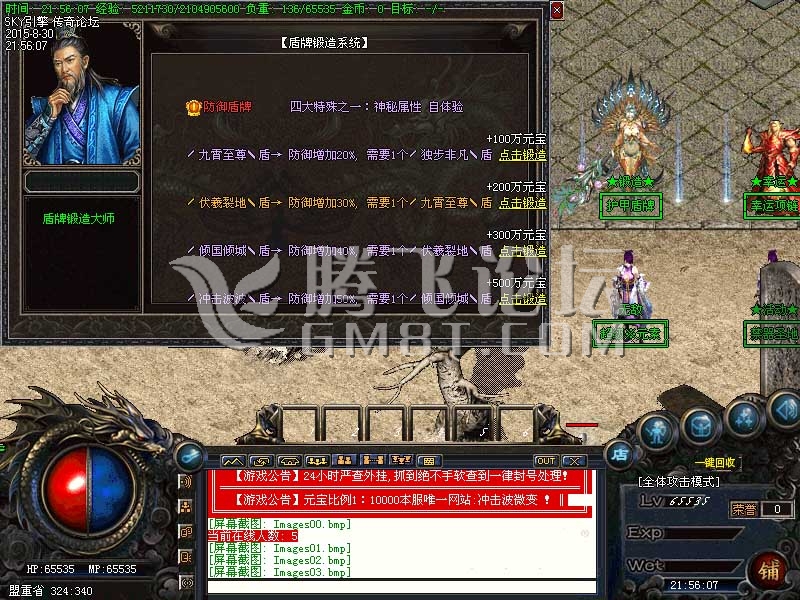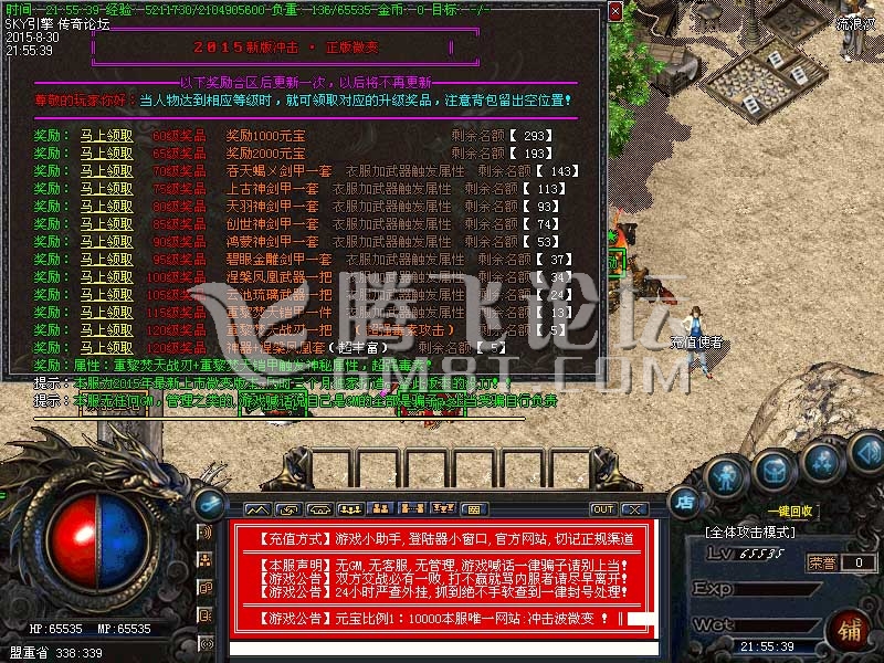 【元宝比例】:1元=10000元宝,点卡赠送80%,网银赠送100%.本服绝无GM模式,游戏私聊自称管理认识管理为骗子,请勿相信骗子!