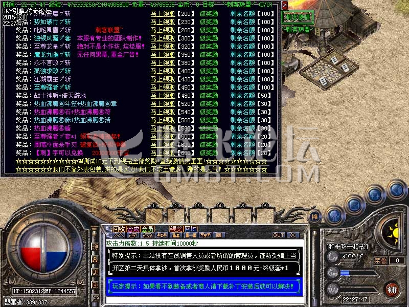 游戏介绍② >> 本服元宝比例1:500W,网银100%,点卡100%,无客服,无比例,无待遇,沙城奖励超值丰厚,重金顶级推广!