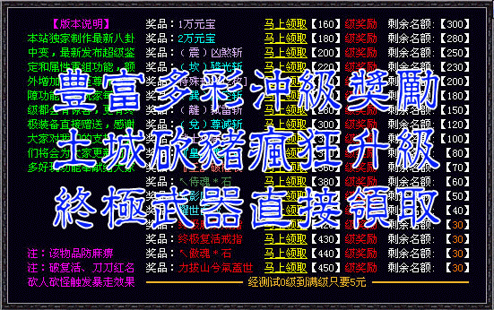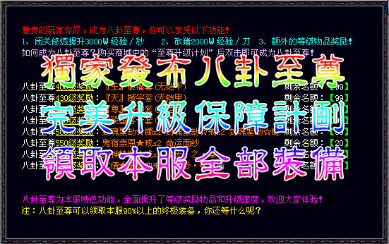 3.新区开放第2天举行全服攻城,新区奖励4亿元宝、老区(天天攻城)奖励2亿元宝! |