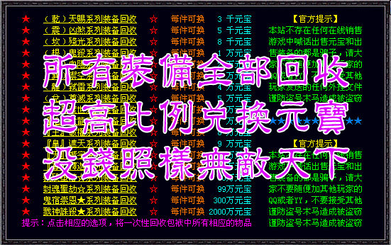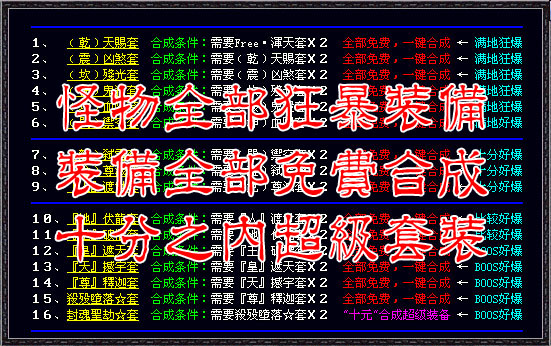 2.本服装备全爆,元宝好打,等级免费,在线回收,在线合成,让你爽到底! |