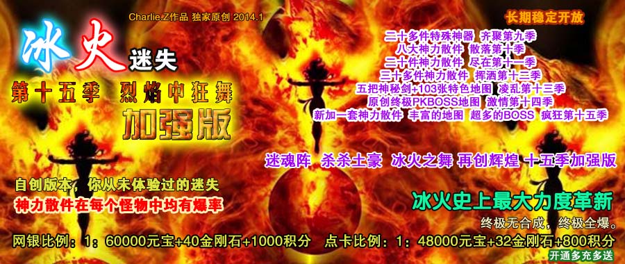 提高前期回收比例20%,增加一个福利地图“冰火狂舞”。增加迷魂阵隐藏地图中终级BOSS数量,降低中期怪物和BOSS的血量和防御,并提高杀杀土豪和迷魂阵和野外BOSS的爆率。增加“冰火之舞”中每小时刷两只“钱多多[宝箱]”和两只“灵丹大仙”。增加“冰火再舞”中每一个半小时刷5只“钱多多[宝箱]”和5只“灵丹大仙”。增加“冰火狂舞”中每两小时刷10只“钱多多[宝箱]”和10只“灵丹大仙”。增加“冰火狂舞”中爆积分的怪物。修正部分BUG(注:盗版是不会修补的)十五季加强版主要针对中期地图,和中后期地图如“迷魂阵”“杀杀土豪”“冰火之舞”等地图中的怪物和BOSS血量、防御、攻击都作了降低,而将爆率提升了一些,让玩家重回14季经典地图的感觉。野外BOSS,恐怖份子集中营,杀杀土豪,迷魂阵等所有BOSS,都有机率爆出15季终级装备。 |