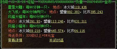 第十季推荐爆神力散件BOSS 八个神力散件在每个怪物中都有爆率,普通怪是几万分之一,普通BOSS是几千分之一,顶级BOSS是千分之一,终级BOSS是百多分之一。 终级BOSS神力散件爆率从高到低排列:“雷霆大雕”“大飞机”“风骚大骚年”“风骚小骚年”“龚琳娜”“周克华”“本拉登” 其它怪物爆率从高到低排列:“10亿以上血量BOSS”“1亿以上血量BOSS”“普通副本BOSS”“普通副本普通怪” |