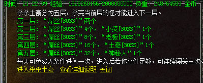 增加几件神力装备,和一个特殊2级头盔,详情查看冰火城皇宫的NPC。 新增恐怖份子集中营第四层,刷新时间请到游戏中查看。 新增随机副本地图BOSS“李某一[BOSS]”和“杀杀土豪”地图中的BOSS。 新增终极特色地图“杀杀土豪”,地图系统脚本为本人独创,请到冰火城皇宫查看NPC。 提高沙奖励,并新增一个沙成员特色福利地图。 提高租宝宝保险的使用时间。 更多更新内容请进游戏中查看。 |