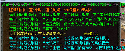 第十一季推荐爆神力散件BOSS 第九季与第十季的BOSS依然不变,另外增加从320级副本“颤抖海”到440级副本“神界天堂”14个副本中随机会刷出九季、十季中的终极BOSS,刷新时会有黄金提示刷新地点和BOSS名字。 另外增加两个特殊BOSS“小鸡鸡”和“大鸡鸡”。也是在320-440级副本中随机刷新,但刷新时不会提示。 “小鸡鸡”无攻无防,血量是终极BOSS的一半,爆率是终极BOSS的3倍。 “大鸡鸡”无攻无防,血量和终级BOSS一样高,爆率是终极BOSS的6倍。 |