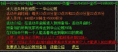 第十四季 末世的战场 十四季最新原创副本“华山论贱”,根据条件参加活动,里面的BOSS爆率全服最最高。 五分之一爆13季终级,十分之一爆14季终级,每天两次活动。具体情况请到游戏中查看。 |