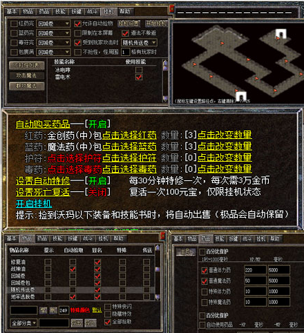挂机注意事项: 1、挂机为了提高效率,可以将F12内挂中的垃圾物品取消拣去取,比如不能自动卖出的药品、卷轴、任务道具等等 图片4 2、挂机一定要准备好足够的金币及元宝。 3、内挂会自动将挂机捡到的垃圾自动卖掉,极品自动保存在背包,所以在设置挂机时可以将一些小物品设置不要捡取 ,否则小极品太多背包满了便会自动回城,比如匕首、木剑、金项链、古铜戒指等等这些小物品尽量后期不要捡取。 4、设置好药品保护,不要设置百分比喝药,尽量设置实际血量喝药(比如自身血量300,你挂机购买的为超红,你便设置 220血量喝药,喝药毫秒不能低于5000毫秒,否则有小概率出现卡药的问题,而且5000毫秒完全低于药品回复时间,没有 任何冲突)。 如图片5