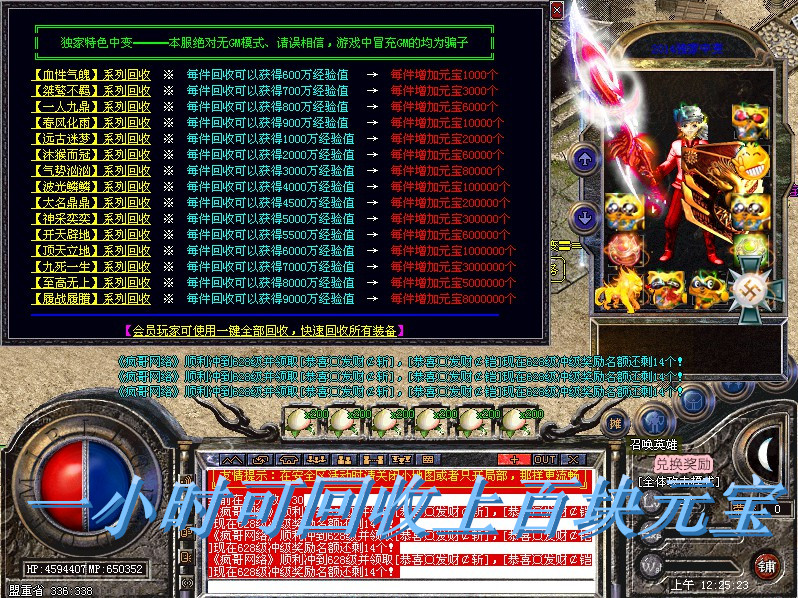 游戏介绍3 >> 大小怪物都可以暴元宝,,奖卷,龙珠,人民币,刮刮彩,物品丰富,不会乏味,只要你肯花时间不花钱照样当爷!