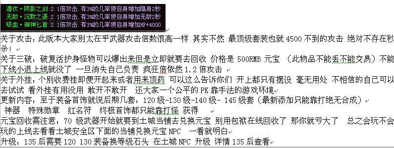 RMB与非RMB:别的剑灵在游戏里打出东西换RMB比如1RMB才兑换1000元宝我们的是兑换3000元宝 更重要的是我们的跟别的合盾牌面巾转身都花的一样的元宝 所以真正是做到时间少你花钱该花 时间多不花一分绝对混起来 怪物: 其它剑灵版 地图少地图小怪刷的慢 我可以这么对比就算5个终极套装的人你也清不光一个地图 并且地图都随机 不存在新区合到老区你打不了怪打不了东西 地图太多 爆率:任何怪物都爆顶级、会玩这的都知道喜欢打12W 24W血的 什么都爆 打的多了爆率就出来了!凡是讲究一个人品吧! 一物在手,天下我有。勋章1.3倍 附带魔法盾 只能靠打绝无合成! 道士非常强大哦!130级 单挑所有BOSS!战士PK依旧无敌!