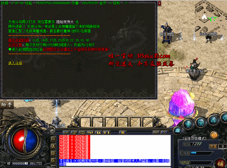 增加一个全新的活动,天地斗场,每天开放6次,每次里面必爆上千金刚石,各种特殊装备数十件!