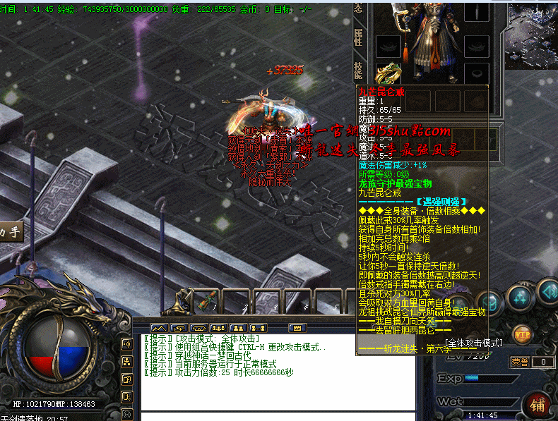 中RMB玩家充值100元直接获得一龙之力 永久6重连杀 可以进入败天邪城刷邪器