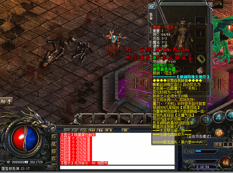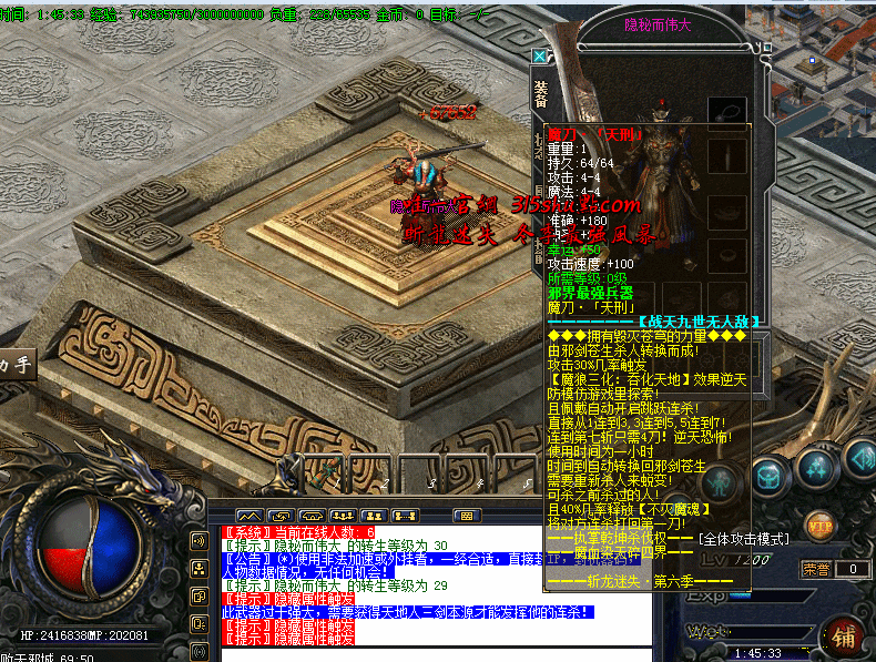 - •增加一件终极武器,邪剑·<苍生>超强逆天属性!每杀死5人将自动转换成太古凶器: 魔刀·「天刑」1小时!