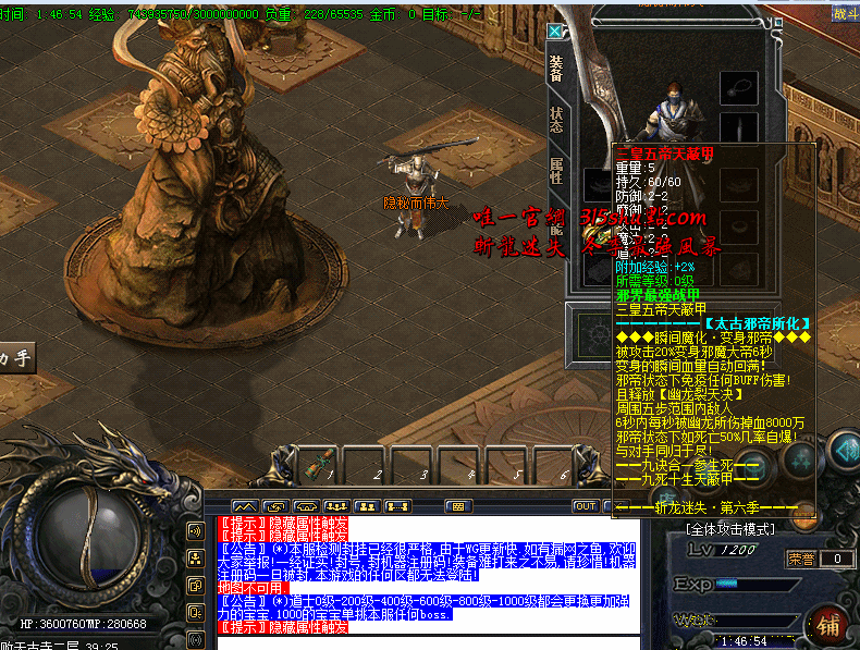 - 增加终极战甲:三皇五帝天蔽甲被攻击20%几率变身邪魔大帝6秒,免疫任何BUFF!且释放【幽龙裂天决】,死亡还会产生自爆!