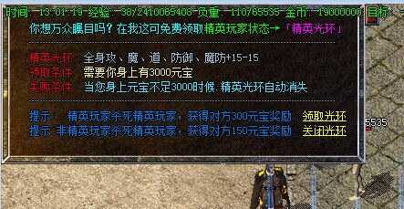 精英光环:全身攻、魔、道、防御、魔防 领取条件:需要你身上有3000元宝,可免费领取 提示: 精英玩家杀死精英玩家,获得对方300元宝奖励,非精英玩家杀死精英玩家,获得对方150元宝奖励.